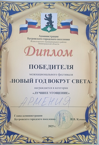 20 декабря 2025 г. в поселке Бугры Ленинградской области прошел ежегодный праздник-фестиваль «Новый год — Вокруг света», организуемый местной Администрацией. Первое место присудили команде армянской общины.