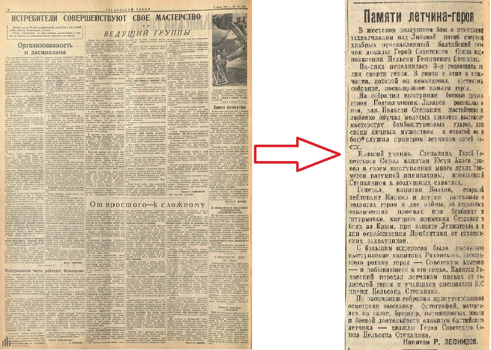 Председатель Секции историков воздухоплавания, авиации и космонавтики (ИВАК) В.В. Лебедев любезно поделился вырезкой о 47 штурмовом авиаполке (шап) из газеты 1947 года — о собрании, посвященном 3-ей годовщине гибели Нельсона Степаняна и Алексея Румянцева. В этой заметке пример того, как небольшой, всего 10-сантиметровый текст 80-летней давности может напомнить об интересном и породить множество вопросов.