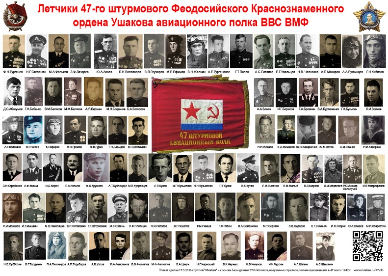 В регулярно обновляемой Базе данных 47 шап на 14.3.2026 732 имени бойцов. В том числе 252 летчика с 1942 года, даже если в полку служили 1-2 месяца. Так, И.Г. Феногенов был стажером, но получил медаль по представлению Н. Степаняна от 23.6.1944 (представление было на орден Отечественной войны 1 степени, но согласовали орден Красной Звезды). Или Дважды Герой Советского Союза (14.6.1942 и 19.8.1944) Н.В. Челноков — он короткий период с августа по октябрь 1943 г. был командиром эскадрильи в 47 шап.