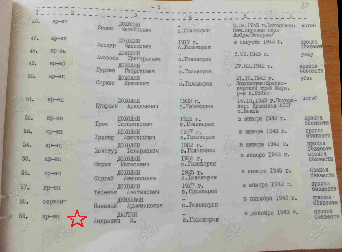 Ищем родственников бойца ВОВ Андраника Давтяна из Лори, погибшего в 1943 г.