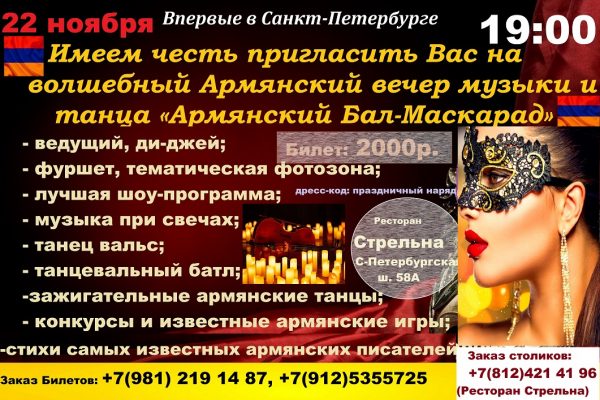 22 ноября 2025 г. в Санкт-Петербурге, в ресторане «Стрельна» (Санкт-Петербургское шоссе, д. 58А) состоится армянский бал-маскарад.
