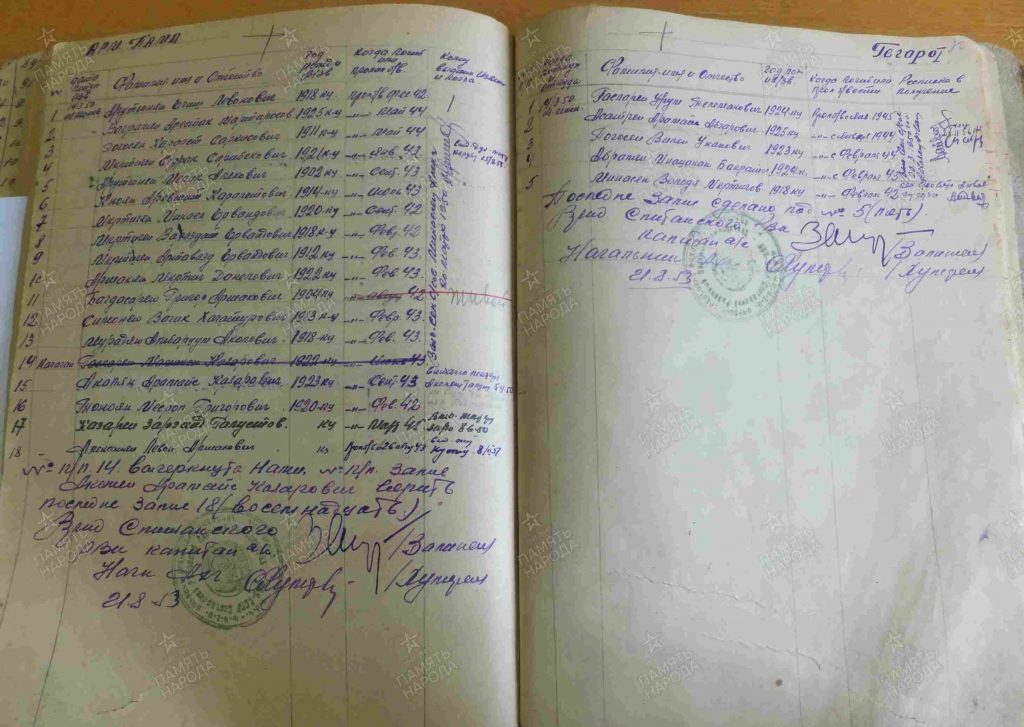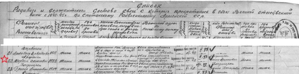В приводимом ниже документе видно, что первоначально он, Григор, был указан как пропавший без вести в августе 1942 г. и на время составления документа (1953 г.) считавшийся умершим.