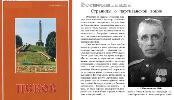 В 2013 г. в историко-краеведческом журнале «Псков» была опубликована статья «Как это было» Н.В. Никитенко по сохранившимся запискам заместителя командира 2-й Калининской партизанской бригады по разведке Александра Павловича Константинова (род. 1901, Ленинград, после ВОВ жил в Тверской области, на фото внизу). Как указано в статье, эти записки сделаны скрупулезно на основе большой переписки с бывшими партизанами. Приводим вторую часть статьи из источника https://cyberleninka.ru/article/n/kak-eto-bylo-zapiski-zamestitelya-komandira-2-y-kalininskoy-partizanskoy-brigady-po-razvedke